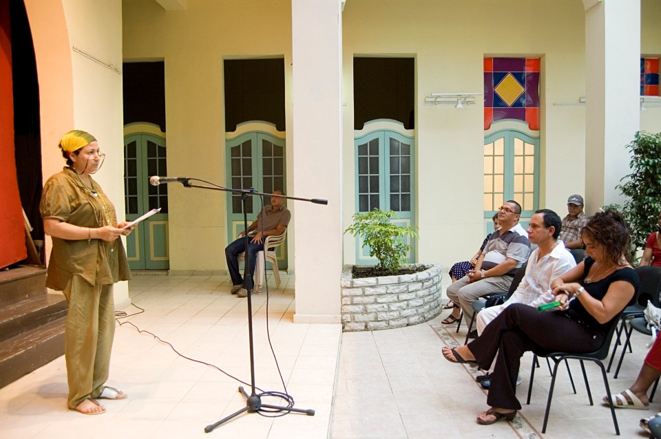 Janet Ortíz durante la presentación de una exposición personal del artista de la plástica Bonachea