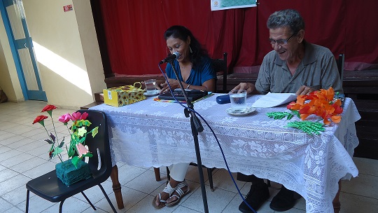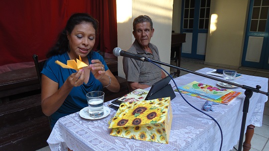 MF: Hace tiempo quería participar en Cantándole al sol, porque tengo unos cuantos textos musicalizados, y me gusta también componer, pero siempre me enteraba tarde de la convocatoria, nunca llegaba a mis manos. Y esta vez, gracias a una poetisa baracoesa, Tula, lo supe con tiempo. Pero entonces me pedían background, y los que tenían eran los dos temas del proyecto: dos canciones que compusimos (…) para el proyecto. Y es que Universo de papel iba a tener su propio programa de televisión; el proyecto de programa fue aprobado por La Habana; y es que se quería que el programa fuera grabado aquí pero para su trasmisión nacional. Pero todo eso se diluyó un poco, (…) y ahí se quedó eso. Yo tengo esperanzas de que en algún momento pueda hacerse, porque era un programa muy educativo, un programa que promueva la literatura y al mismo tiempo promueve el arte del origami; además de que siempre hay mucha espiritualidad en todo lo que yo hago con niños. (…) Y para eso fue que creamos esos dos temas que iban a ser el de inicio y el de cierre. Y entonces se quedaron como temas del proyecto; lo utilizamos al principio y al final de nuestras actividades. Tuvimos suerte en esta edición… no es suerte, es que esas canciones la escribimos con mucho amor. Una ganó el Premio de Interpretación, que es «Universo de papel», que la canta ella [llama a la niña que interpreta la canción, Dailén Iglesias Lorenzo], y Leo, defendió Vamos a la vida, que la canción con la que siempre cerramos y resultó premiada como Composición; y es una canción que explica mucho cómo yo quisiera que fuera la infancia, llena de alegría y de amor sobre todo.