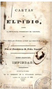 Suplico a V. que me diga con franqueza (…) por qué han sido mal recibidas mis Cartas a Elpidio. ¿Es por las doctrinas que contienen? ¿Es por el modo de presentarlas? Es por mero odio, tan inesperado, en vez del aprecio con que me honraban mis paisanos”, escribe el P. Félix Varela en agosto de 1839. El primer tomo de estas cartas1[i], Sobre la impiedad, había sido publicado en Nueva York en 1835, y todo parece indicar que la reacción de los grupos más conservadores de la sociedad colonial cubana no fue la esperada. El P. Varela había llegado a experimentar incluso apuros económicos, como expresa claramente en carta del 5 de junio de 1839 a José de la Luz y Caballero, su discípulo: “En cuanto a las desgraciadas Cartas a Elpidio le suplico a V. encarecidamente que vea cuanto antes al Dr. Sánchez (…) y que le diga que sin pérdida de momento me mande todos los ejemplares para ver si puedo venderlos en otra parte o quemarlos, para sacar cualquier cosa con que pagar los gastos de impresión. Estoy apuradísimo (…)”.