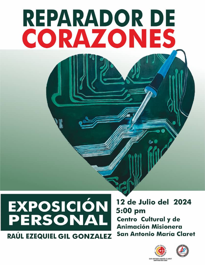 “No es una exposición más”; así definió Mirtha Clavería la muestra Reparador de corazones, exposición personal del artista Raúl Ezequiel Gil González, que se inauguró en la tarde de este 12 de julio, en la Galería 1 del Centro Cultural y de Animación Misionera San Antonio María Claret (CCAM). Y es que entre las múltiples singularidades que definen la muestra, es la primera que se realiza en el Centro Claret como resultado de un Premio Colateral otorgado por la institución, en este caso, durante el Salón del Caribe del año anterior.